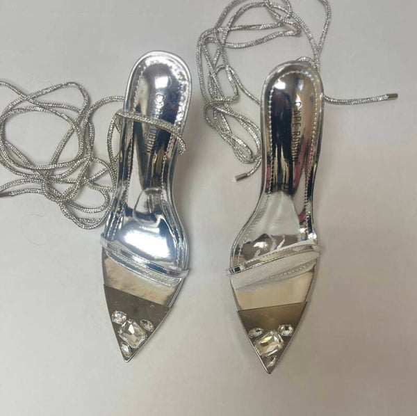 Cape Robbin mirror finish silver stiletto heels with embellishment at toe