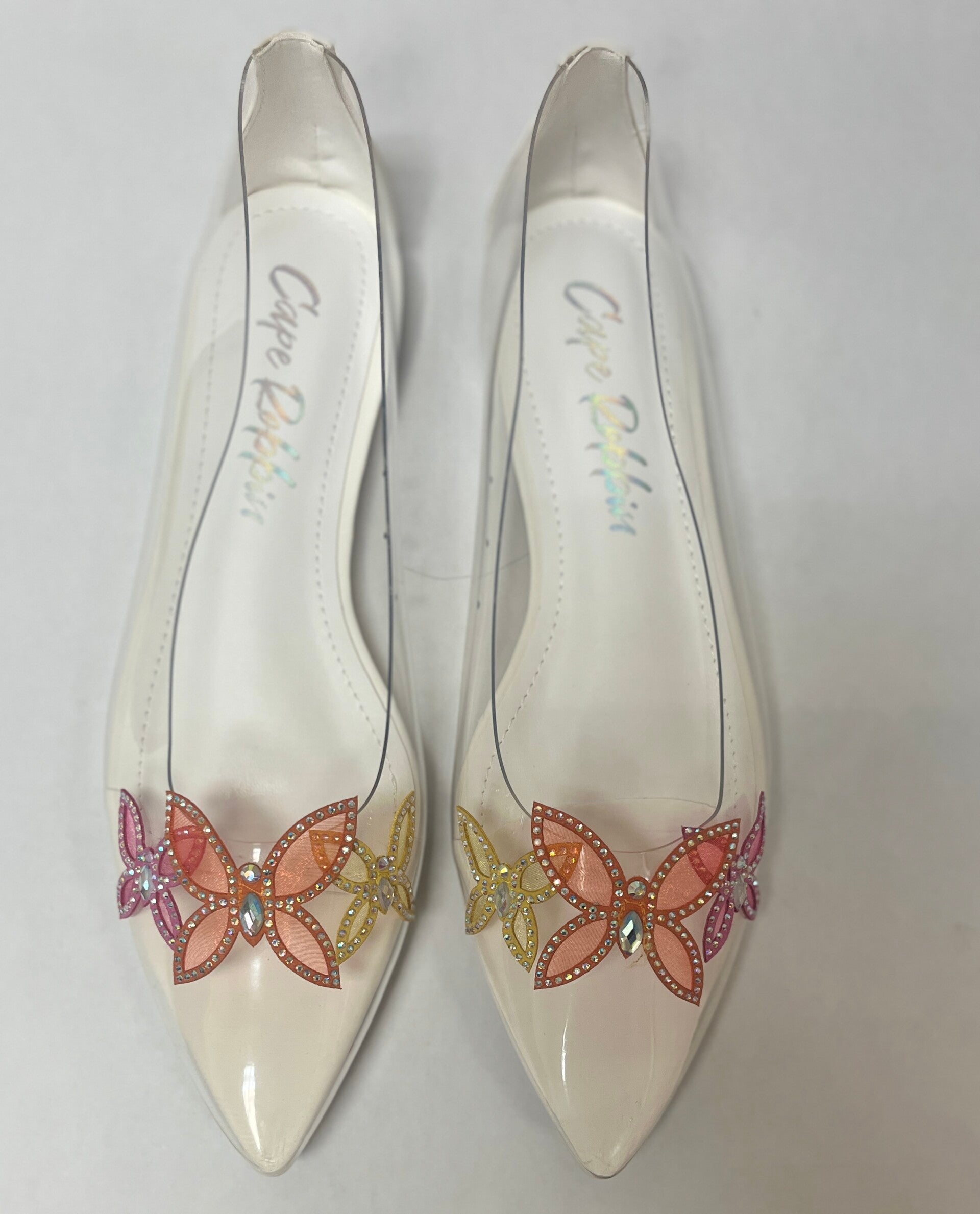 Cape Robbin clear pointy toe flats with multi color butterfly embellishments